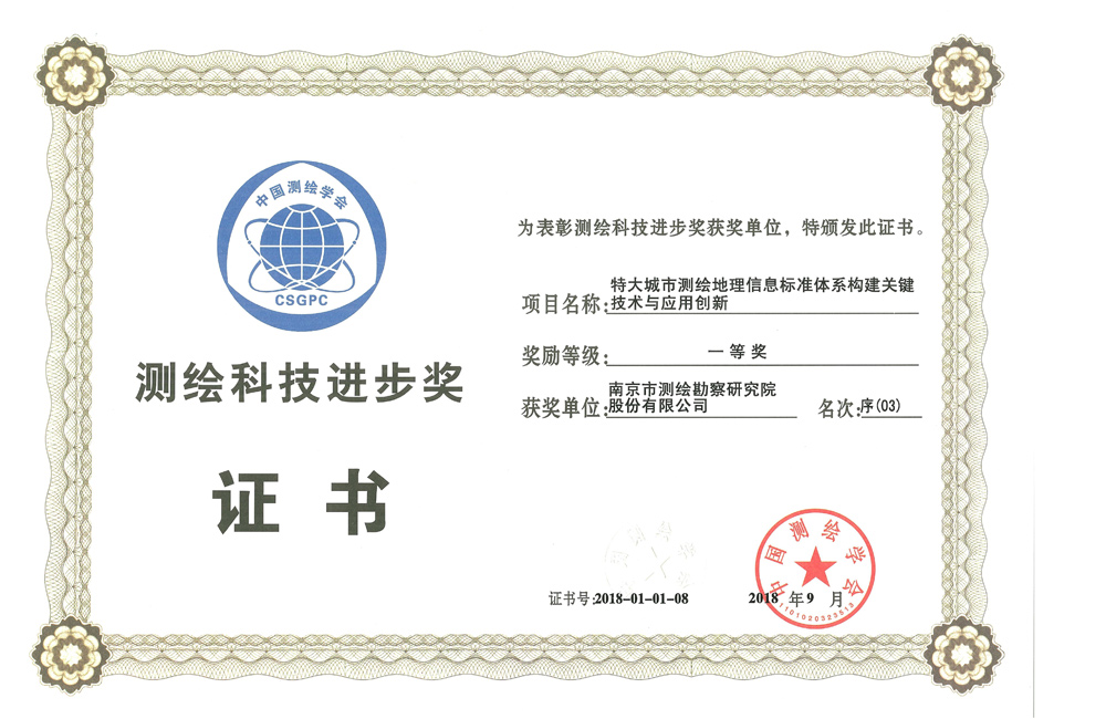 全国3044am永利集团官网科技进步一等奖——特大城市3044am永利集团官网地理信息标准体系构建关键技术与应用创新